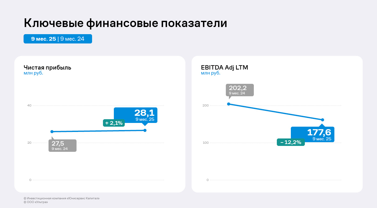 По итогам 9 мес. 2025 года выручка ООО «Ультра» увеличилась на 7% в сравнении с АППГ до 1,3 млрд руб. Рост в 3 квартале намного значительнее в связи с началом восстановления спроса крупных клиентов из сферы онлайн-торговли и строительства, а также с развитием нового направления деятельности.
