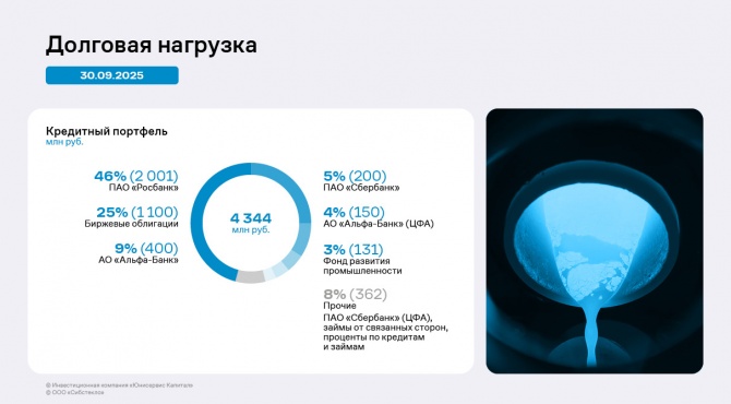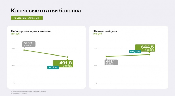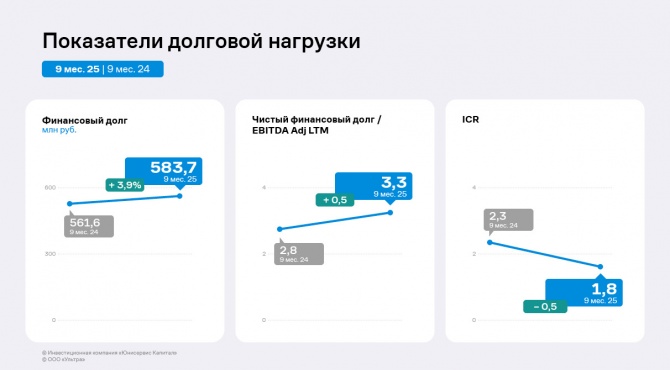 Финансовый долг на 30.09.2025 составил 583,7 млн руб., что на 3,9% выше значений на 30.09.2024 г. В 3 квартале эмитент привлёк дополнительное финансирование на пополнение оборотных средств в размере 170 млн руб. При этом долг увеличился несущественно благодаря тому, что ранее компания провела оферты по облигационным займам, а также частично погасила часть полученных кредитов.