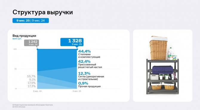 Ключевыми позициями в структуре выручки эмитента за 9 месяцев 2025 года стали стеллажи и комплектующие, а также прессованный решётчатый настил, доли которых составила 44,4% и 42,4% соответственно. Реализация прессованного решётчатого настила началась в конце 2024 года, на сегодня это драйвер роста выручки компании. Потребители продукции направления — склады и маркетплейсы, а ключевой клиент компании — крупный игрок рынка онлайн-торговли. Ранее ООО «Ультра» заключило и исполнило контракт для партнёра на сумму в 200 млн руб.