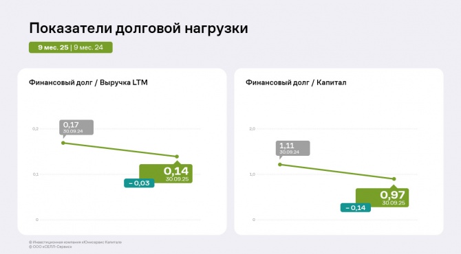 Долговая нагрузка по итогам периода показывает разнонаправленную динамику. С одной стороны, снижение коэффициентов отношения финансового долга к выручке LTM до 0,14 и финансового долга к капиталу до 0,97 свидетельствует об улучшении структуры баланса и снижении зависимости от заёмного финансирования.