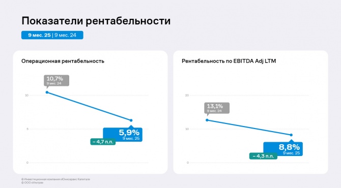 По итогам 9 месяцев 2025 года показатели рентабельности уменьшились: операционная рентабельность составила 5,9%, что на 4,7 п.п. ниже уровня АППГ, а рентабельность по EBITDA Adj LTM снизилась до 8,8%. Основная причина — рост операционных расходов, однако руководство компании отмечает, что это контролируемая динамика, после завершения оптимизации показатели рентабельности возрастут.