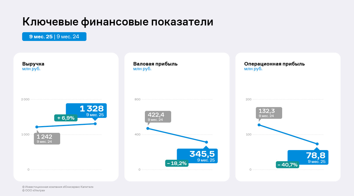 При этом валовая и операционная прибыли сократились на 18% и 41% соответственно. В группе компаний «Ультра» продолжается оптимизация, а рост операционных расходов ещё превышает доходы от продаж. К концу 2025 года руководство эмитента намерено завершить оптимизацию и существенно сократить расходы компании.
