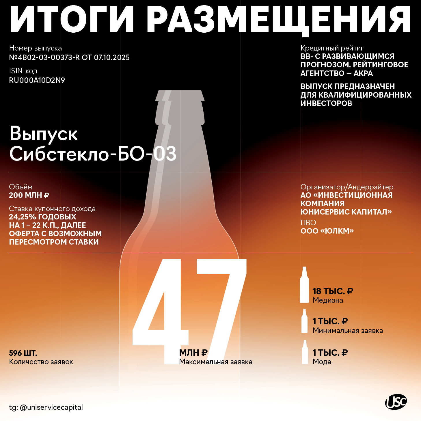 Напомним, что выпуск Сибстекло-БО-03 объёмом 200 млн руб. был размещён со ставкой купонного дохода в размере 24,25% годовых на период с 1 по 22 к.п., после — безотзывная оферта с возможным пересмотром ставки. Номинал одной бумаги будет равен 1 000 руб. Срок обращения — 3 года, в течение которых компания будет ежемесячно выплачивать купонный доход. Цель дополнительного финансирования — пополнение оборотных средств с учётом планов по рефинансированию текущих обязательств.