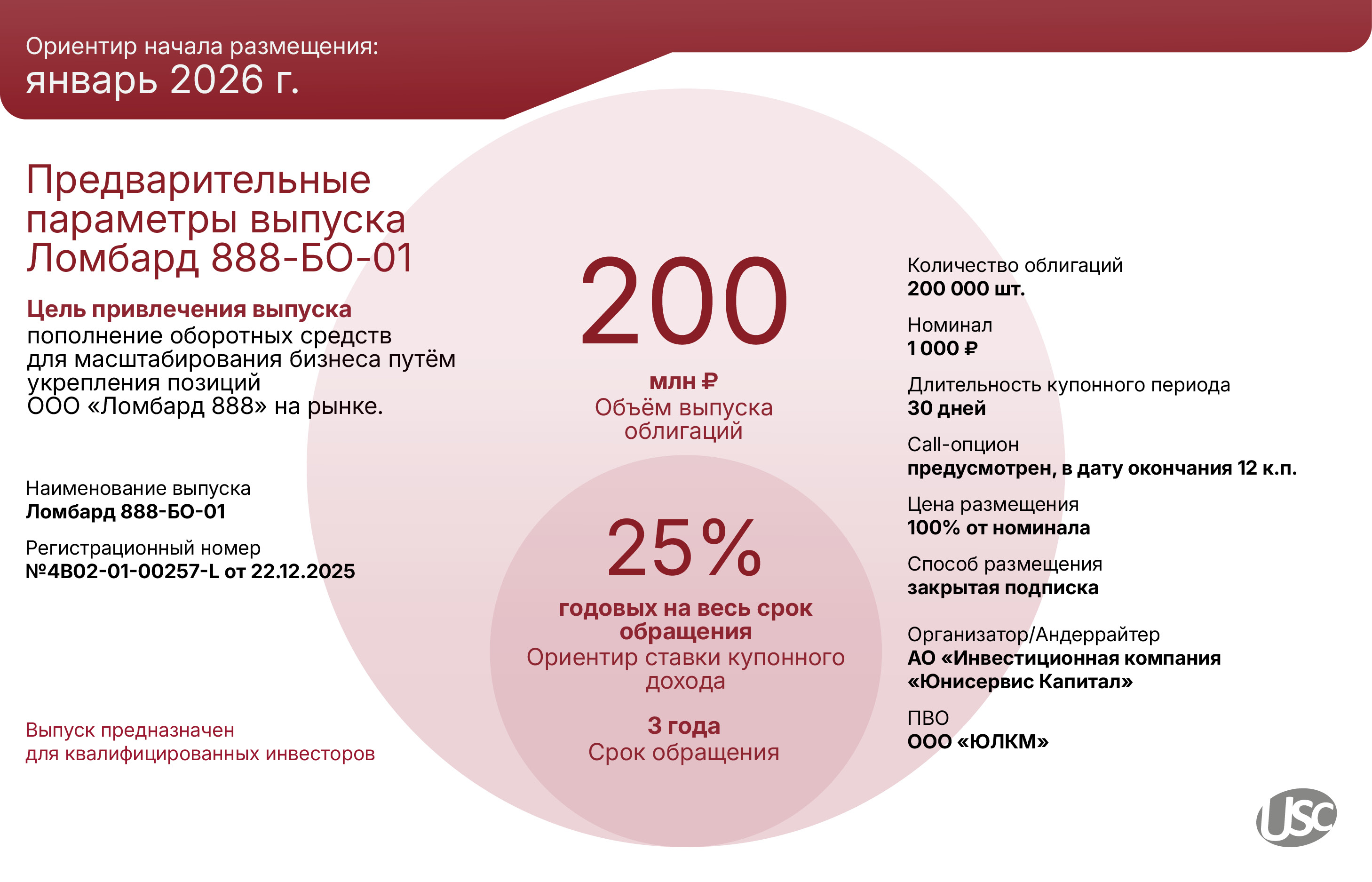 Размещение выпуска Ломбард 888-БО-01 (№ 4B02-01-00257-L от 22.12.2025) запланировано на январь 2026 года. Предварительно его объём составит 200 млн руб., номинал одной бумаги — 1 000 руб. Ориентир ставки купонного дохода — 25% годовых на весь срок обращения в 3 года. Выплата купонного дохода ежемесячная. Также эмитент намерен предусмотреть возможность проведения call-опциона в дату окончания 12 к.п.